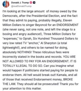 Я обращаю внимание на огромную сумму денег, которую демократам пришлось выплатить после президентских выборов, а также на тот факт, что они признались в выплате, вероятно, незаконно, 11 млн долларов певице Бейонсе за поддержку (она ни разу не запела, ни одной ноты, и покинула сцену под гудение и гнев аудитории!), 3 млн долларов в качестве «расходов» …