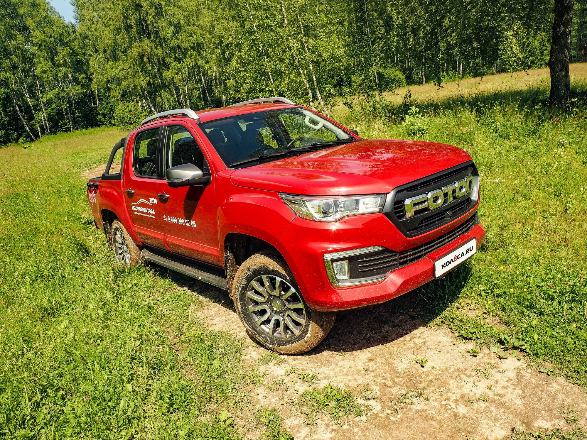 Вместо массивной хромированной поперечной балки с эмблемой – крупный, на всю облицовку, логотип Foton. Все остальные элементы – две поперечные балки и простая геометрическая решетка за ними – черные. Фары утратили изначальную «раскосость» и сопряжены с шестиугольной рамкой облицовки тоже черного цвета. Головная светотехника прожекторного типа, но с галогенными источниками. Вроде бы это не слишком модно, зато поменять лампочку не составляет никаких проблем, даже если такая необходимость возникла далеко от цивилизации. Бампер теперь полностью окрашен в цвет кузова. Это несколько повышает его уязвимость при контакте с препятствиями, но от контакта с грунтом его защищает размещенный под бампером дополнительный элемент, окрашенный в черный цвет. Противотуманные фары поменяли очертания, а над ними в ряд разместилась цепочка дневных ходовых огней.