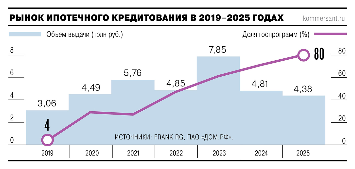 Драйвером роста станет дальнейшее постепенное снижение ключевой ставки, которая, по оценке ЦБ, может опуститься до 12% к концу года. При этом доля льготной ипотеки после вступления в силу новых ограничений должна существенно сократиться. По оценке ПАО «Дом.РФ», в 2025 году на нее пришлось около 80% выдачи — рекордное значение за все время ее использования. Однако в 2026 году ожидается разворот, «банки будут активнее развивать классические ипотечные продукты и рефинансирование», считает господин Косяков.