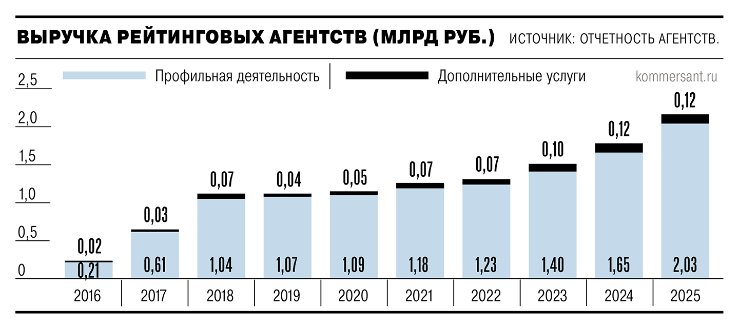 Совокупная выручка четырех российских кредитных рейтинговых агентств по итогам 2025 года превысила 2,1 млрд руб., увеличившись на 21% по сравнению с предшествующим годом, следует из опубликованных отчетов о прозрачности. При этом лидеры рынка — «Эксперт РА» (выручка 947 млн руб.) и АКРА (846 млн руб.) — показали рост на 16–20%. Вышедшие на рынок значительно позже агентства НКР и НРА показали рост выручки на 34–41%.