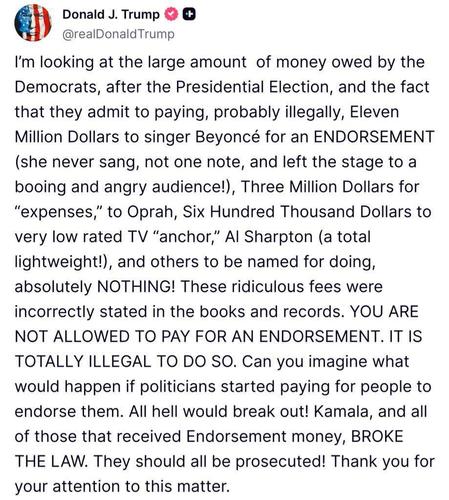 Я обращаю внимание на огромную сумму денег, которую демократам пришлось выплатить после президентских выборов, а также на тот факт, что они признались в выплате, вероятно, незаконно, 11 млн долларов певице Бейонсе за поддержку (она ни разу не запела, ни одной ноты, и покинула сцену под гудение и гнев аудитории!), 3 млн долларов в качестве «расходов» для Опры, 600 тысяч малоизвестному телеведущему Эл Шарптону (полностью ничтожному!) и ещё другим, имена которых будут раскрыты, за то, что они делали абсолютно ничего! — написал Трамп в социальной сети Truth Social.